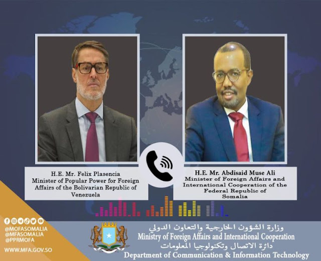 daajis.com:- Wasiirka Arrimaha Dibadda iyo Iskaashiga Caalamiga ah, Mudane Cabdisaciid Muuse Cali ayaa khadka telefoonka wada hadal kula yeeshay dhiggiisa Arrimaha Dibadda ee Dalka Venezuela Mudane Felix Plasencia, iyaga oo ka wada hadlay xoojinta xiriirka labada dal.
